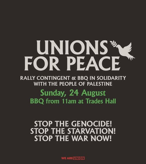So get your friends and workmates together and join us at Trades Hall for a BBQ, before we set off to State Library to join the Nationwide March for Palestine!